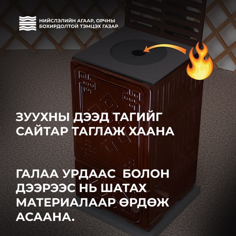 • Галаа урдаас нь болон дээрээс нь шатах материалаар өрдөж асаана.