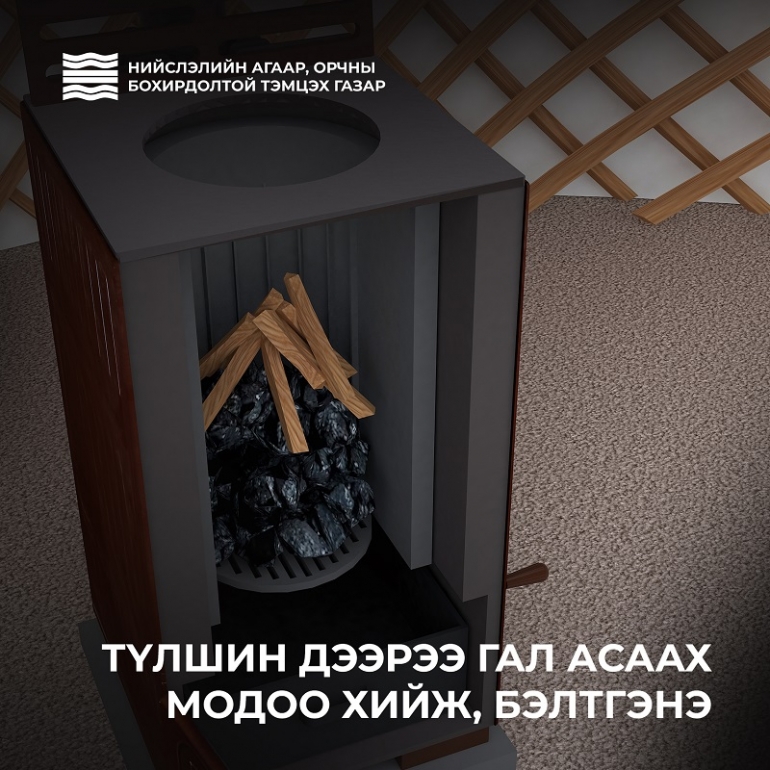 • Түлшин дээрээ гал асаах модоо хийж бэлтгэнэ.