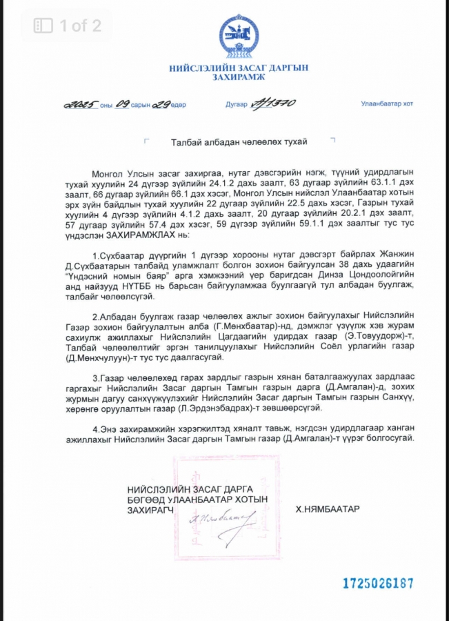Тиймээс НЗД-ын хэрэгжүүлэгч агентлаг Газар зохион байгуулалтын албанаас Газрын тухай хуулийн 27 дугаар зүйлд заасны дагуу талбай чөлөөлөх мэдэгдлийг хүргүүлсэн. Гэсэн ч шаардлагыг биелүүлээгүй тул Монгол Улсын засаг захиргаа, нутаг дэвсгэрийн нэгж, түүний удирдлагын тухай хууль, газрын тухай хуульд үндэслэн талбай албадан чөлөөлөх Нийслэлийн засаг даргын захирамж гаргасан болно.